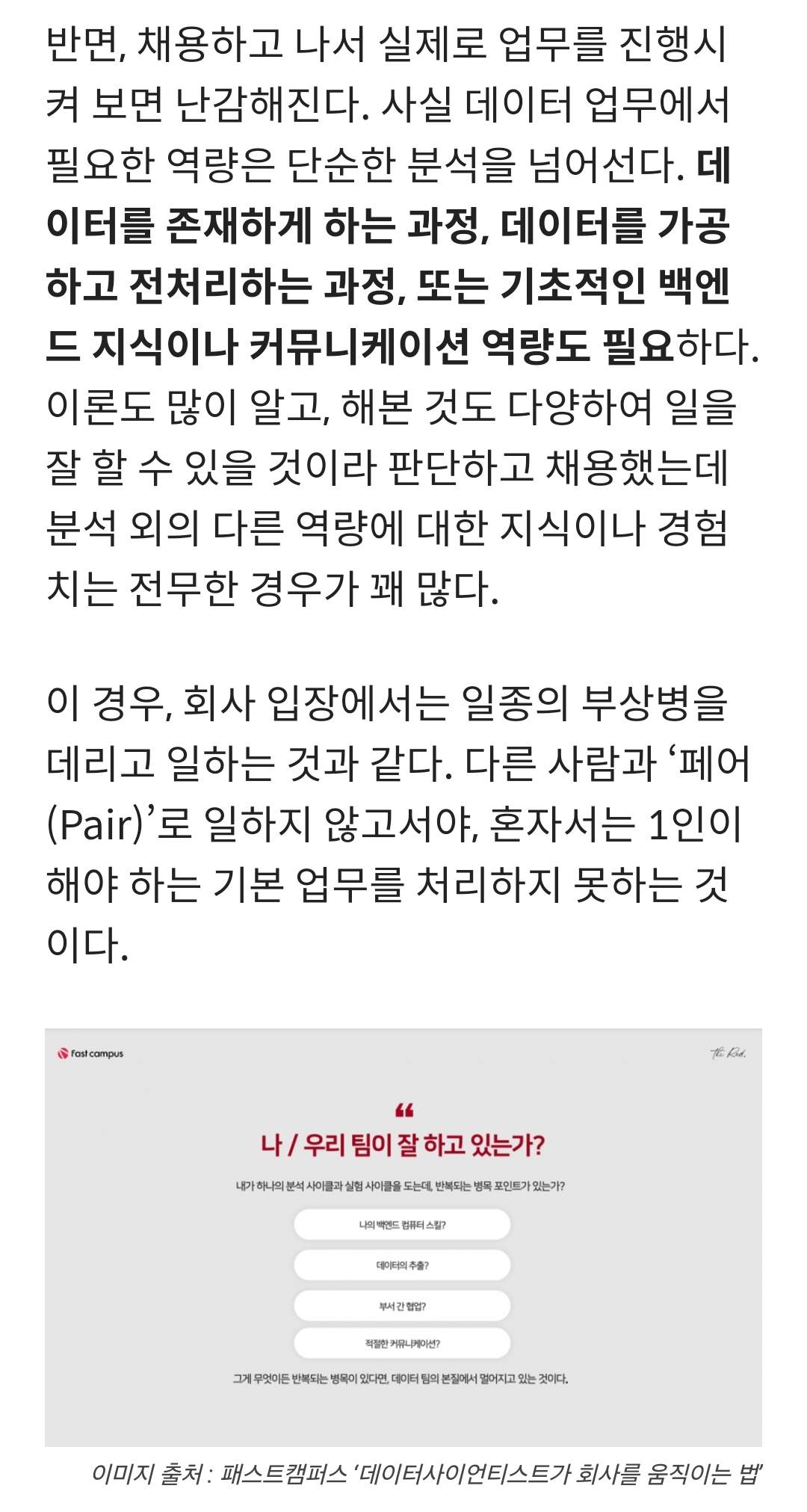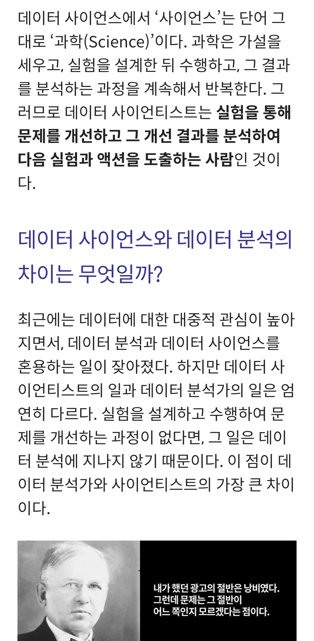 실험을 설계하고 수행하여 문제를 개선하는 과정은 데이터 분석이 아닌 사이언티스트의 영역이다.